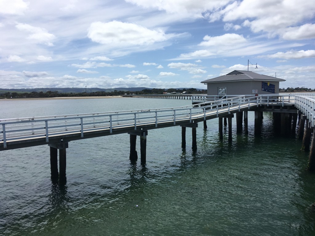 As Jettys go it is about a 800 metres long and it is solid. There is a little display near the end and an old diving bell from the oil exploration days. You get a great view of the town and Corner Inlet from the end of the Jetty but for fisher folk it’s a great facility. They have provided rod holders and cutting trays along the way and a couple of tables with water for cleaning fish. There are a series of little shelters you can sit in protected from the sun rain or wind and fish. Worth a visit just to read the history (displayed at the start of the jetty) and to experience the sea air and view from the end. A bracing walk on a cool spring afternoon.