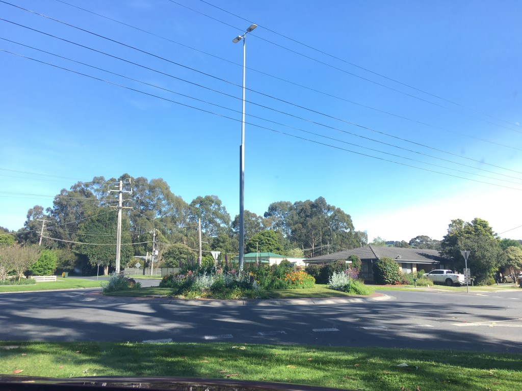 Outside Foster Tourist Information OfficeLovely planting on the roundabout.Impressive township sign.Oh dear roadworks…only a 10 minute holdup luckily.