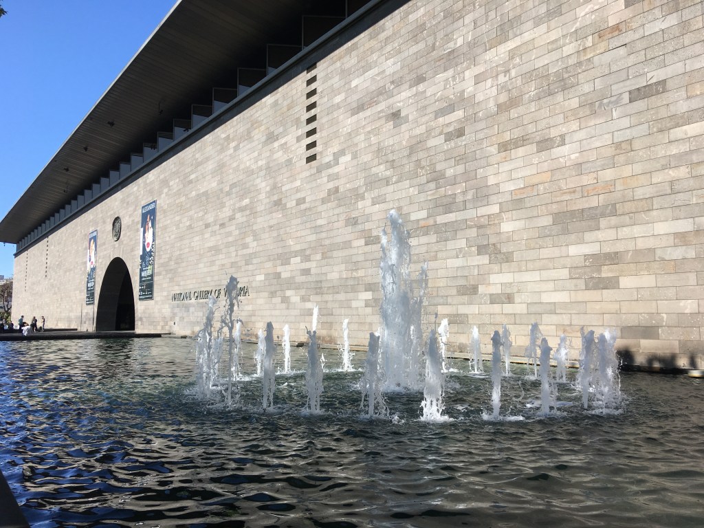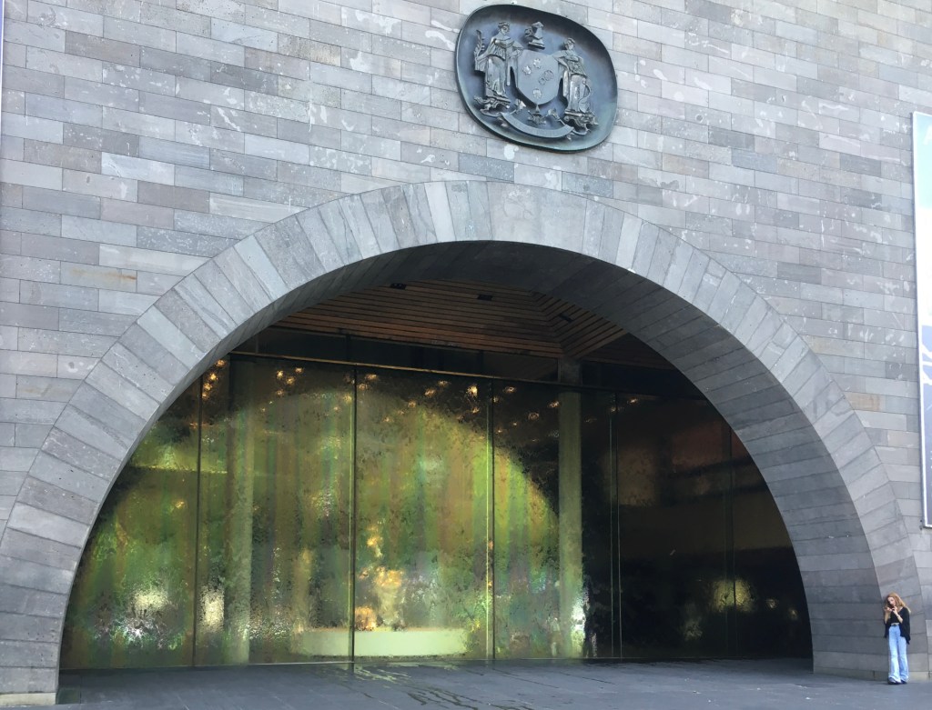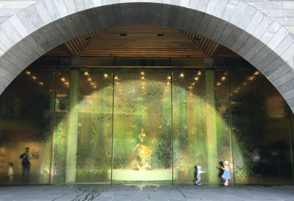 The Waterwall at the entrance to NGV International marks the beginning of the Water Trail. The Waterwall runs separately to the moat system, with its own water holding tank and treatment plant. Rain water is pumped from underground tanks into the Waterwall holding tank and then through a treatment plant to the Waterwall head. The water cascades down the glass, before flowing back into the holding tank to repeat the cycle. The constant flow creates a natural filter between the bustle of the city and the calm seclusion and ambience of the Gallery.